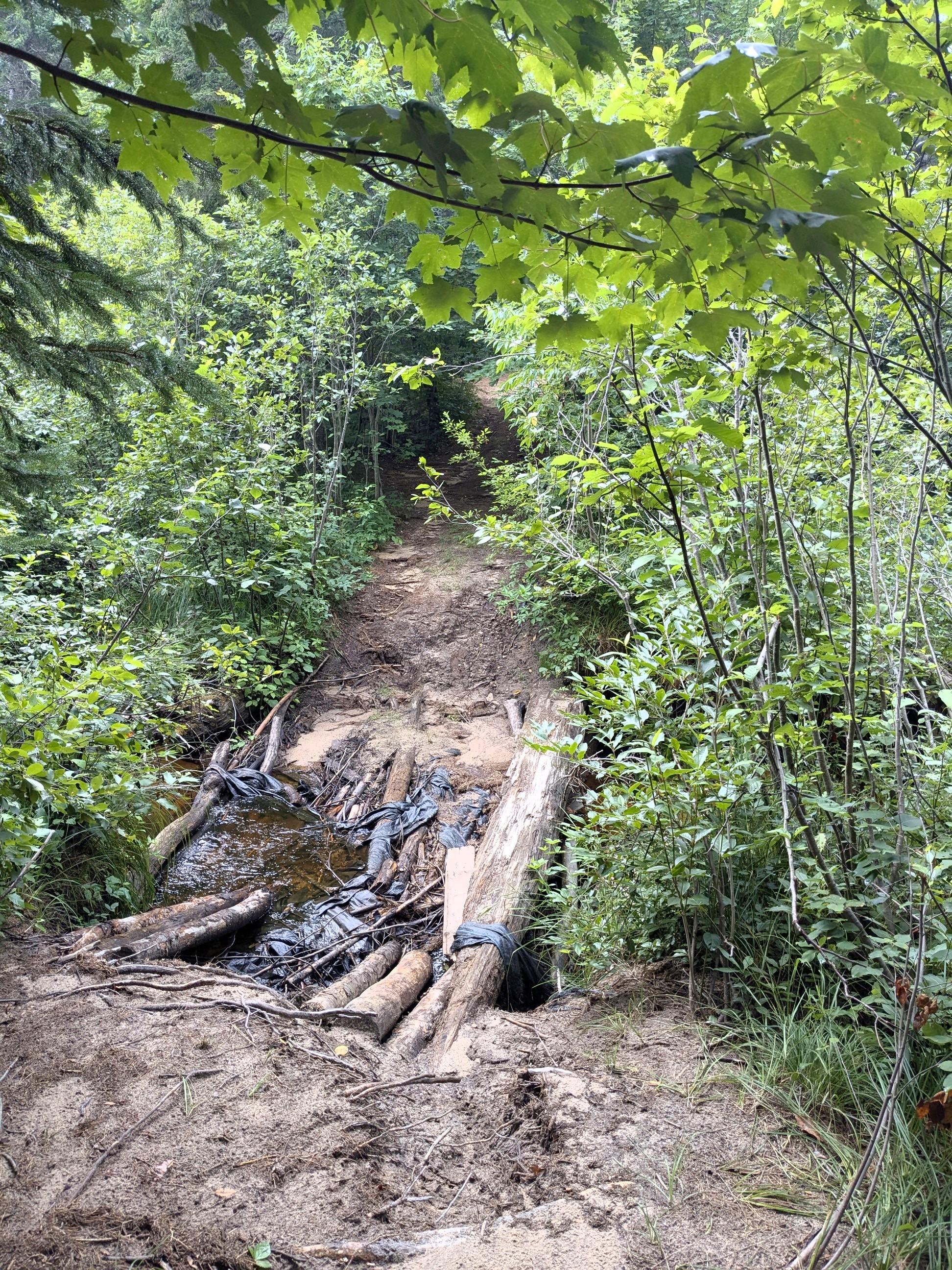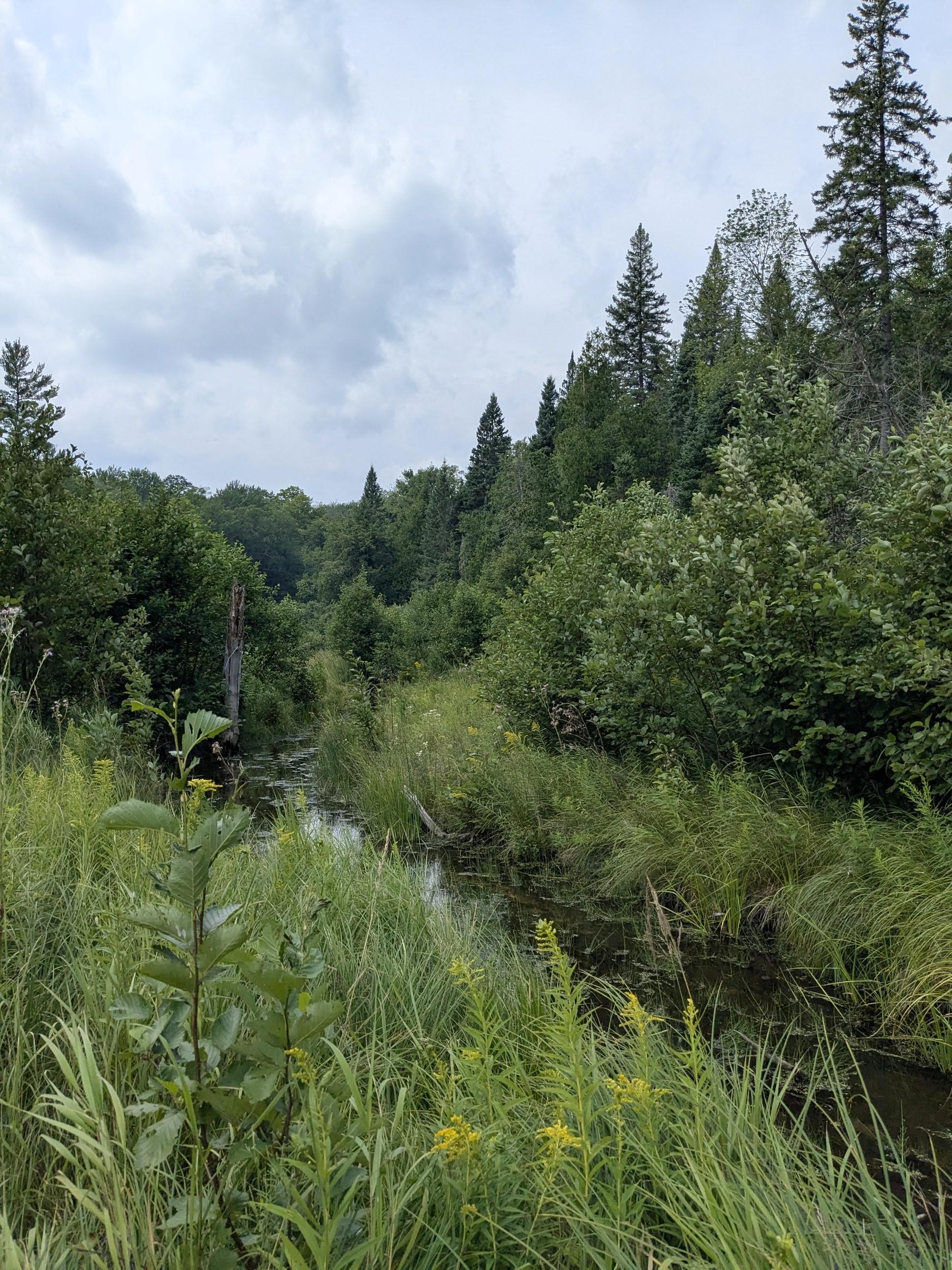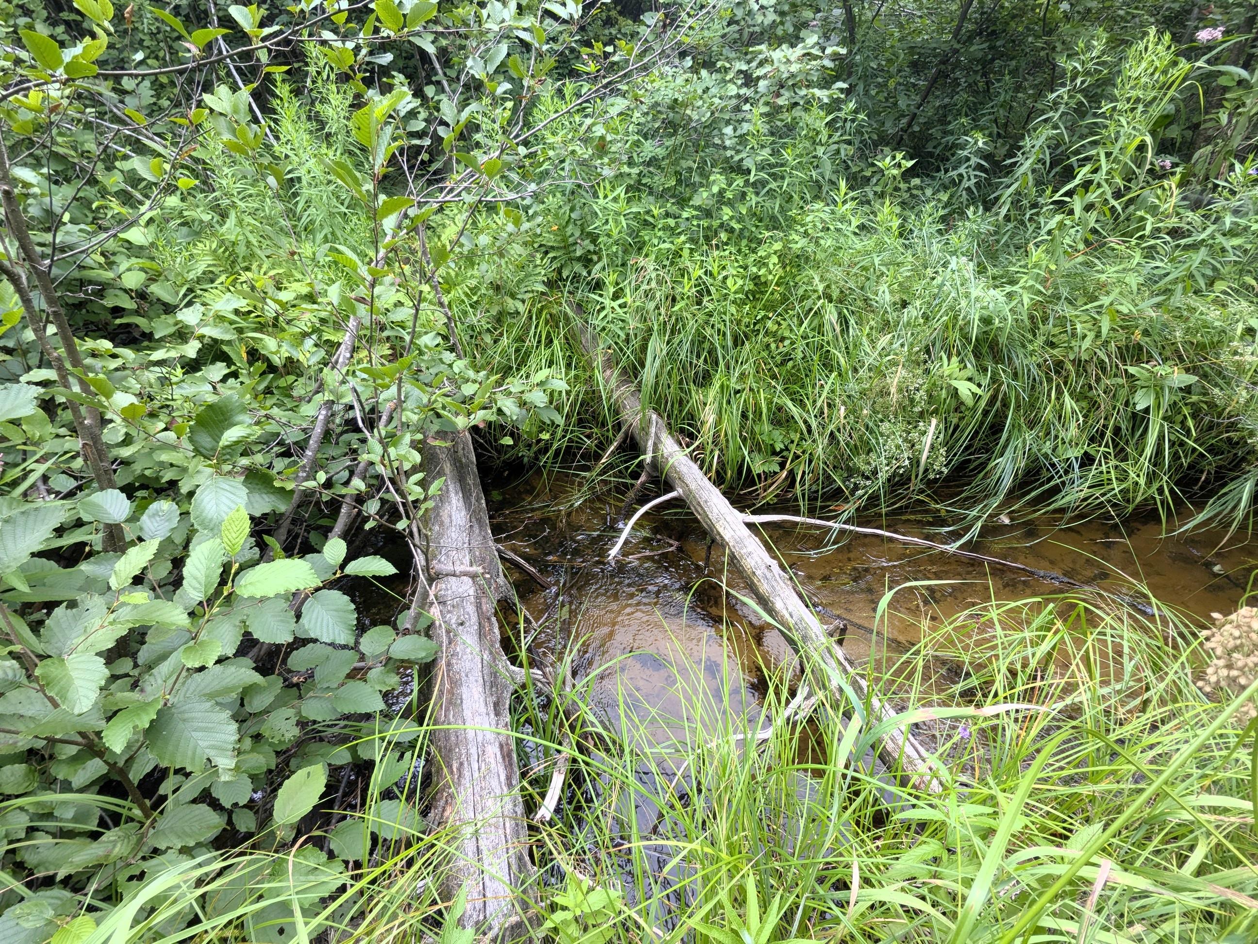 Given that the grass was wet and despite it being a Sunday I decided to stick to main trails. I figured it would be better to come back drenched due to the heat, not the grass from going off trail. I hiked to the end of McCloud Grade and stopped by Atwood Camp. Moving on I continued down the road going past the pit where Ted's truck had gotten stuck then past the pit where the Bronco got suck. Pushing on I crossed the North Branch of the Two Hearted River, saw the ruined camp site, and then finally got to unexplored roads. In the past I had always turned south, parallel to the river, now I decided to hike the most northerly trail. It did become grassy at some point but it had been long enough that the grass had at least partially dried out. The trail mostly went where the map said, ending on the west side of the North Branch of the Two Hearted River. A small bushwhack to the river led to two logs "fallen" parallel to each other bridging the water. It makes one wonder if this is coincidental or if there is something to discover on the other side. Seeing nothing and with nothing suggested on the map I turned back. The return trip was straightforward though there were a few cloudbursts. Fortunately there was no steady rain and I did not encounter anyone on the road. It was about a 10.5 mile hike.