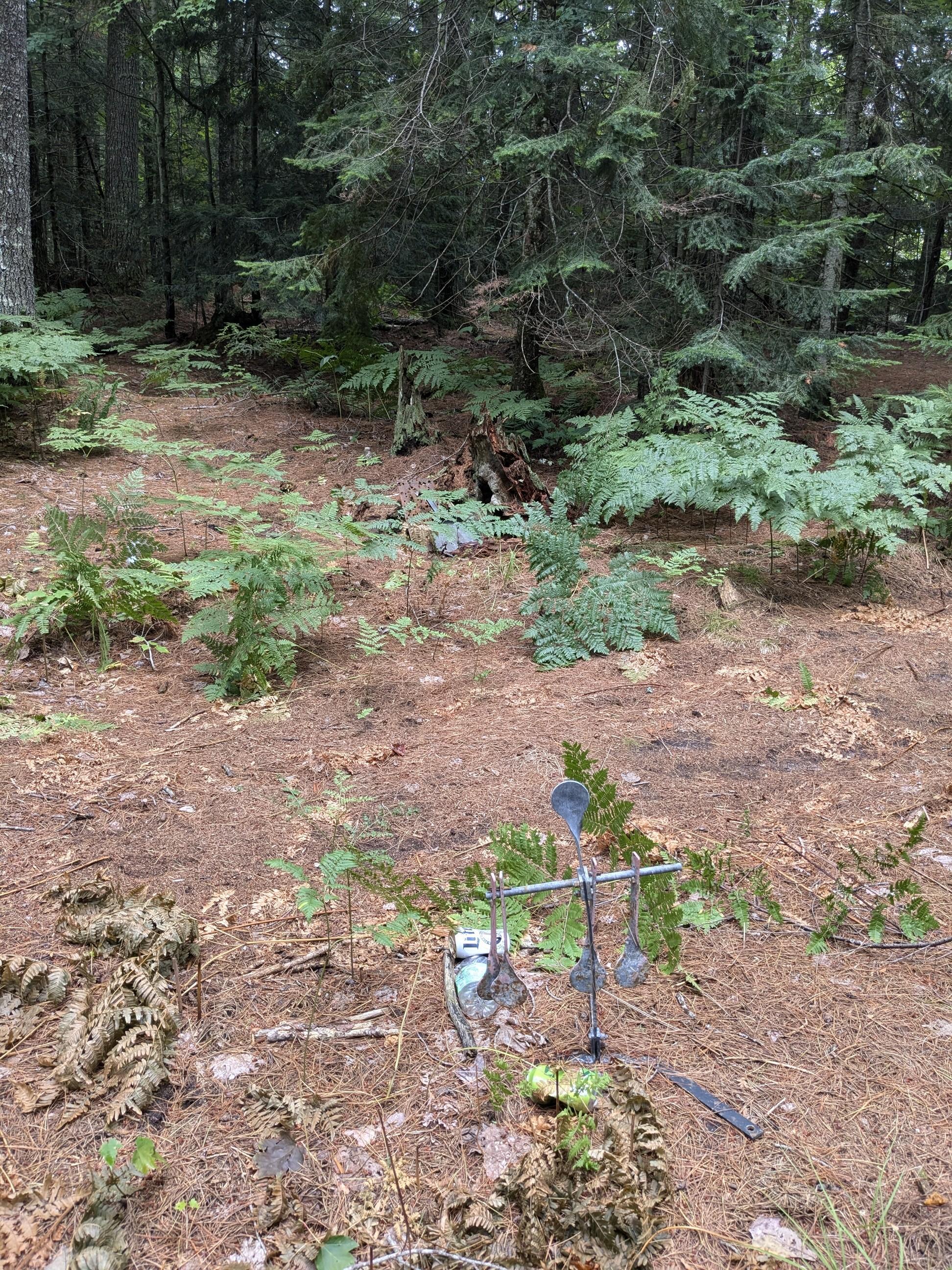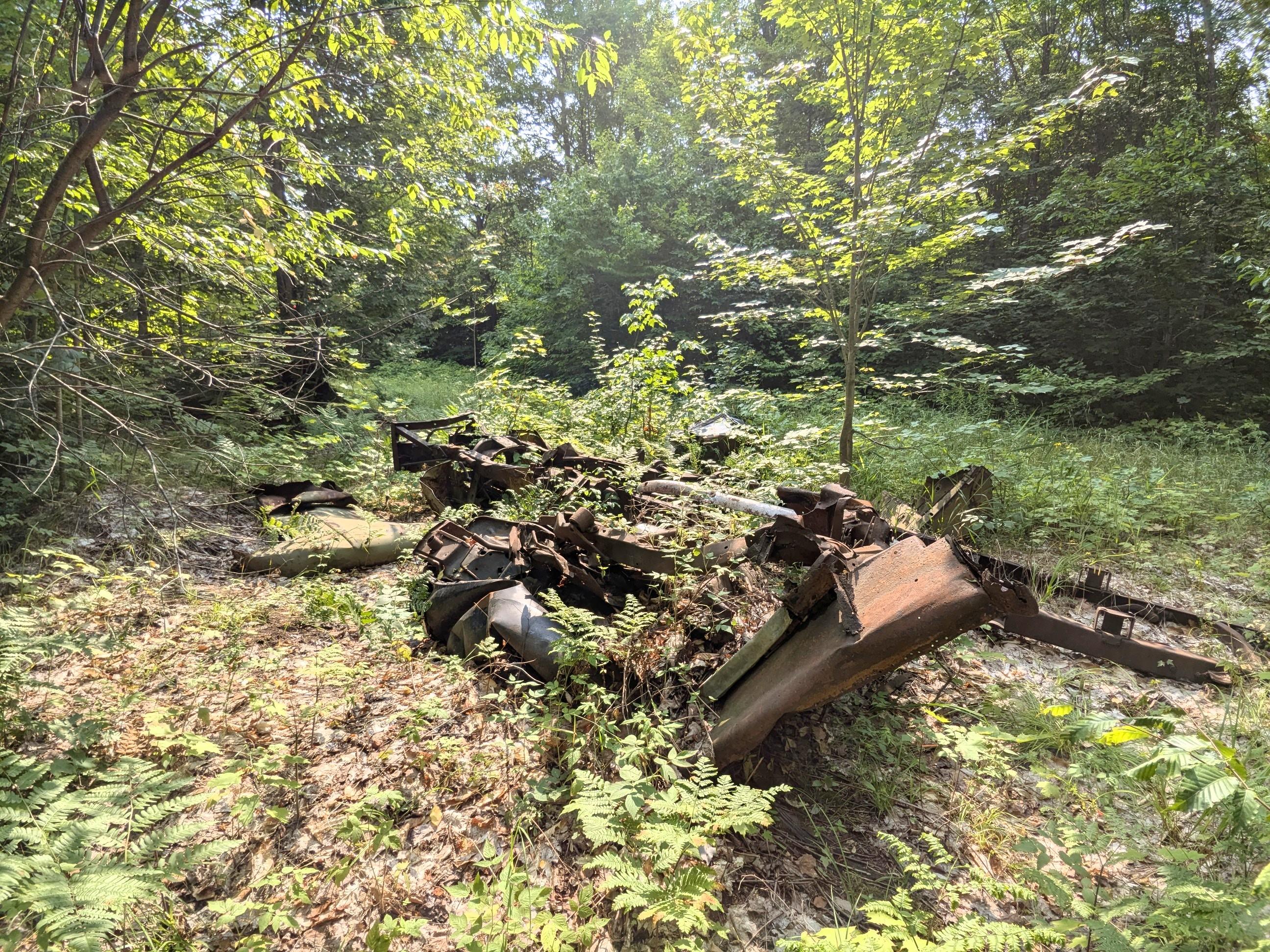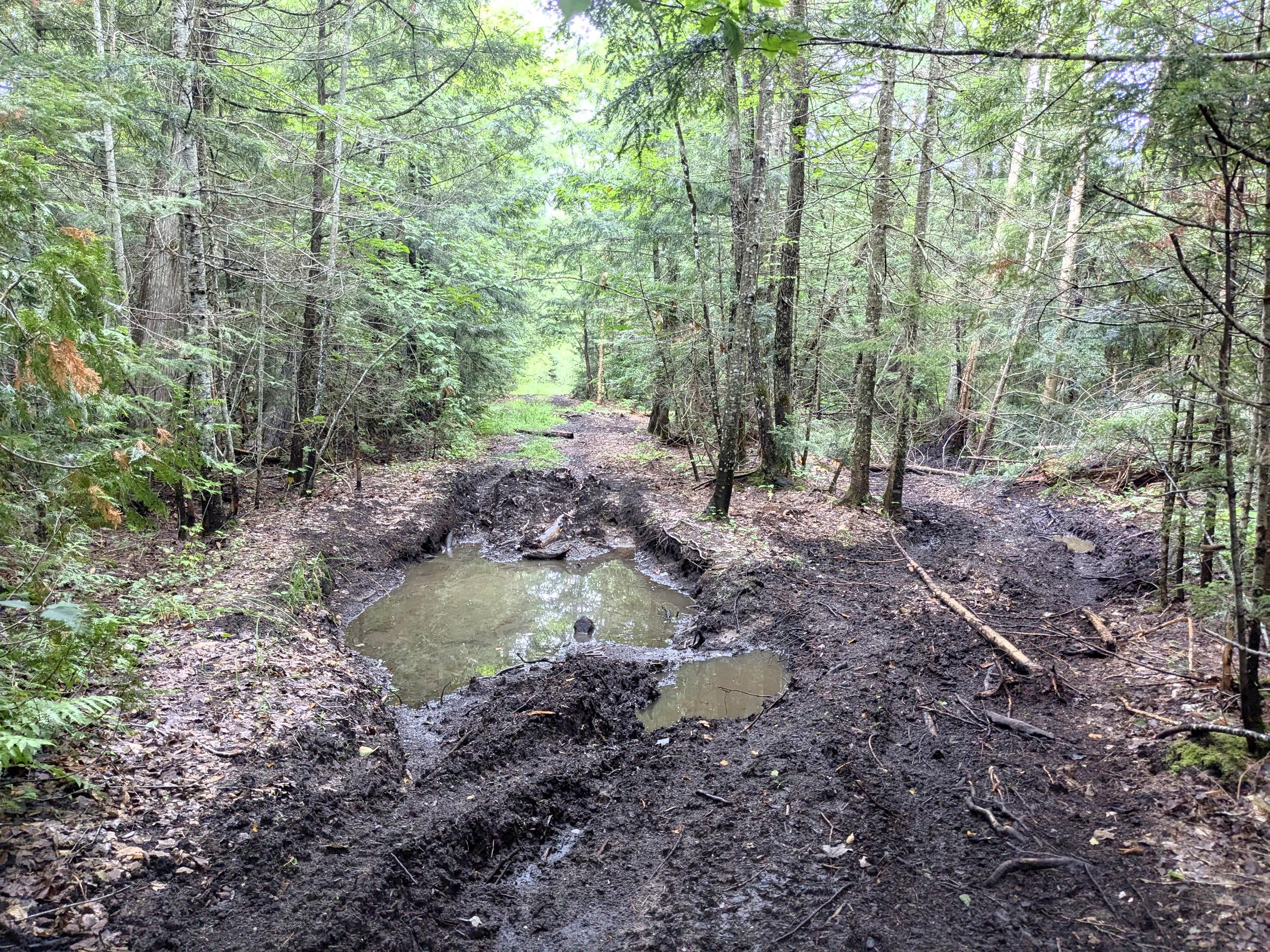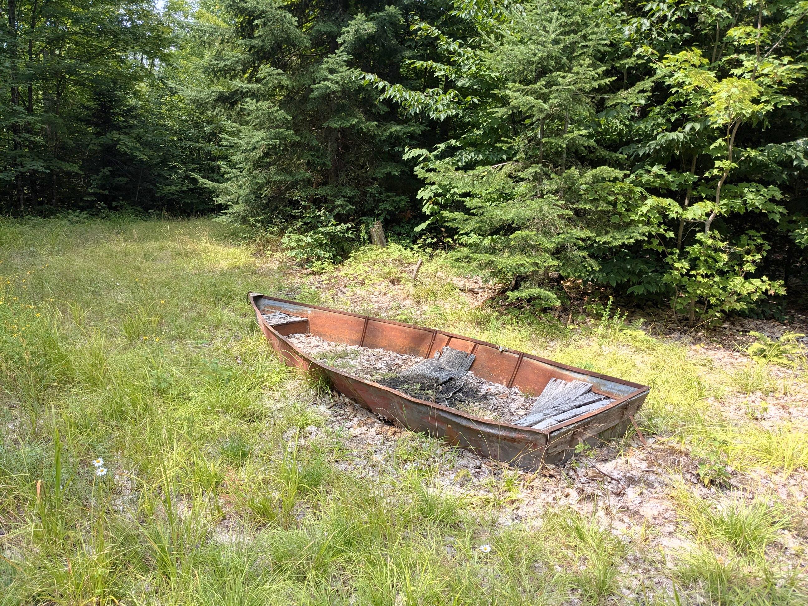 Given that the grass was wet and despite it being a Sunday I decided to stick to main trails. I figured it would be better to come back drenched due to the heat, not the grass from going off trail. I hiked to the end of McCloud Grade and stopped by Atwood Camp. Moving on I continued down the road going past the pit where Ted's truck had gotten stuck then past the pit where the Bronco got suck. Pushing on I crossed the North Branch of the Two Hearted River, saw the ruined camp site, and then finally got to unexplored roads. In the past I had always turned south, parallel to the river, now I decided to hike the most northerly trail. It did become grassy at some point but it had been long enough that the grass had at least partially dried out. The trail mostly went where the map said, ending on the west side of the North Branch of the Two Hearted River. A small bushwhack to the river led to two logs "fallen" parallel to each other bridging the water. It makes one wonder if this is coincidental or if there is something to discover on the other side. Seeing nothing and with nothing suggested on the map I turned back. The return trip was straightforward though there were a few cloudbursts. Fortunately there was no steady rain and I did not encounter anyone on the road. It was about a 10.5 mile hike.