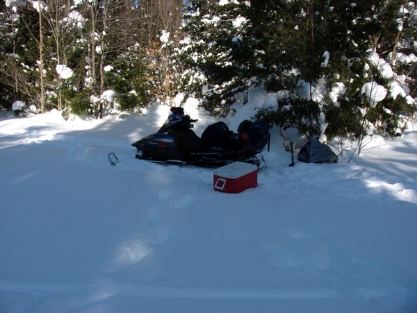 Bill and Doug took the first load in. They dropped the gear near the start of the driveway and snowshoed the trail into the Cabin. It took Paul and I a little while to get the load on the second snowmobile ready so we did not arrive until Bill and Doug had done at least one trip on the snow shoes. I just dropped off gear and went back for Jon. The trails were in exceptional shape due to all the snow they had gotten and the work of the groomers. We were able to fly over the trails and all arrived at the Cabin in short order. On bad trails it can easily take an hour for a round trip. We were making it in about half that time.