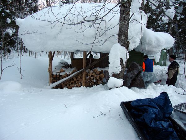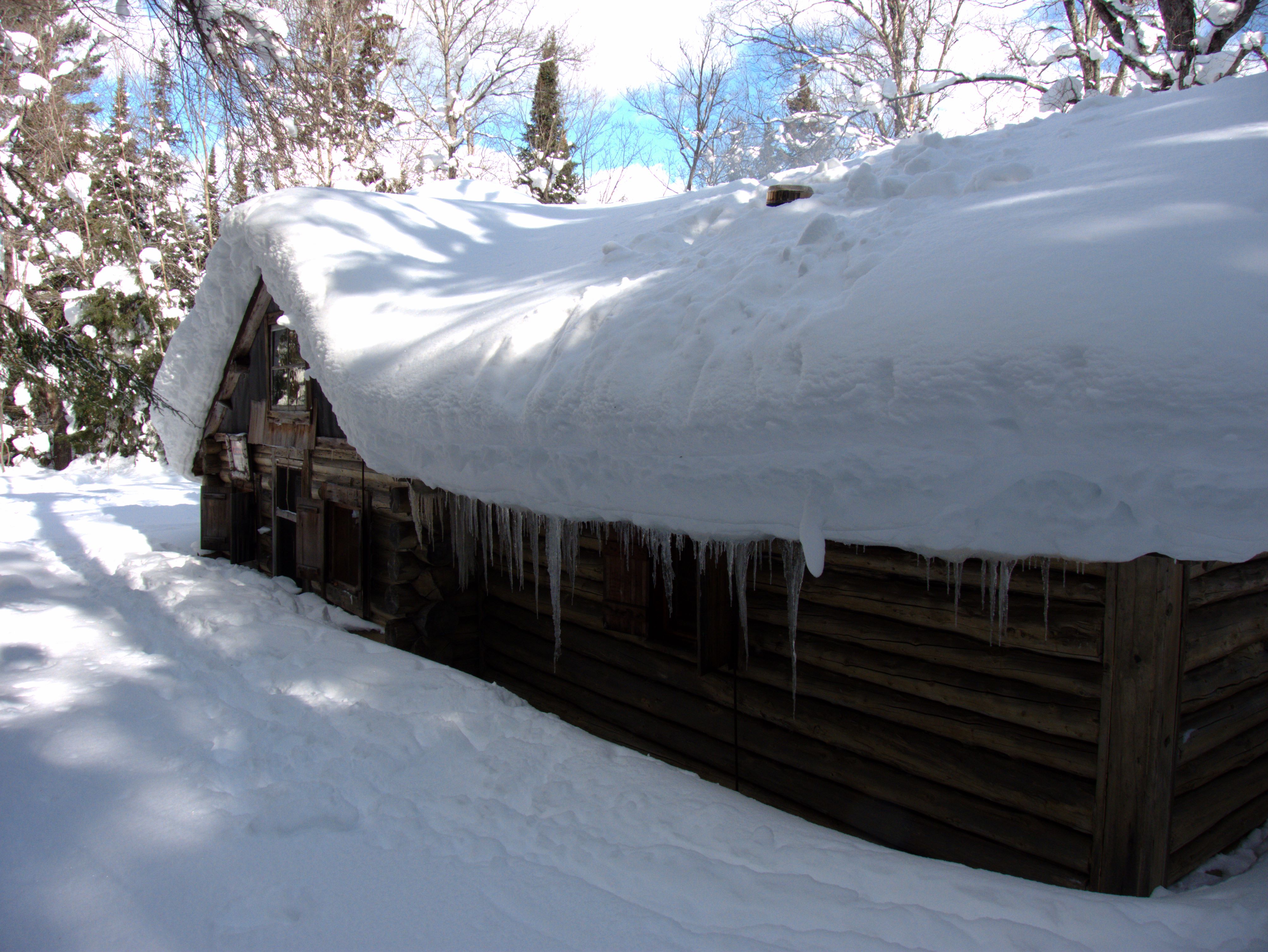 Paul pretty much decided our plans for the rest of the day when he went onto the roof with a shovel and a lid from one of the plastic bins. Due to the depth of the snow on the ground and that overhanging the roof, there was a small, easy drop off the Cabin. Naturally, Paul took the opportunity to slide down the roof on the plastic lid. From there Bill slid down riding a shovel and then everyone else joined in. It quickly escalated. We propped a piece of plywood between the ground and the roof, covered it with snow, and began shaping the path from the roof across the area in front of the Cabin. (As the runs continued we eventually added another piece of plywood for further support.) Bill pulled an old toboggan out of one of the sheds. It has been up there unused for a long time, we finally found a good use for it; tobogganing from the roof!