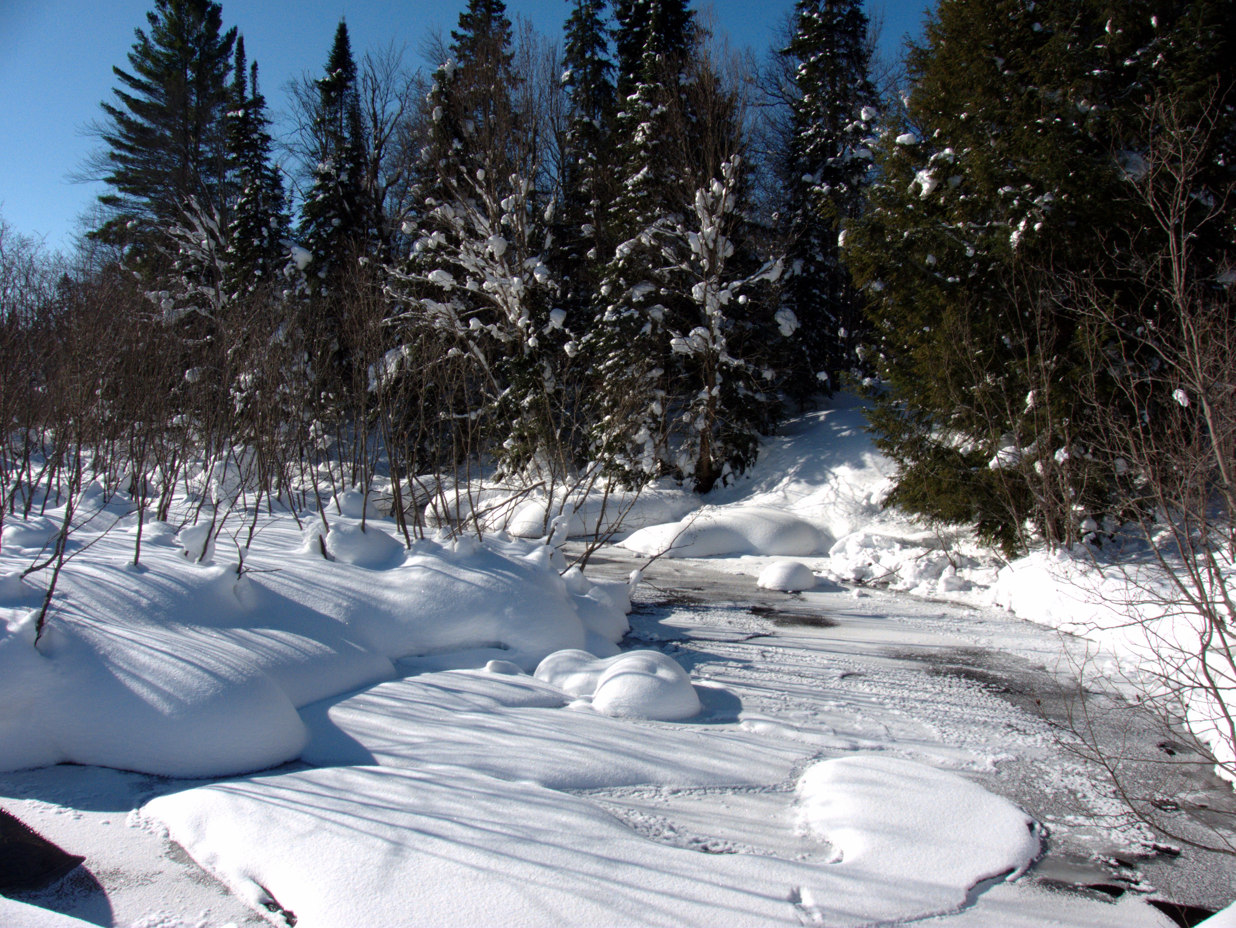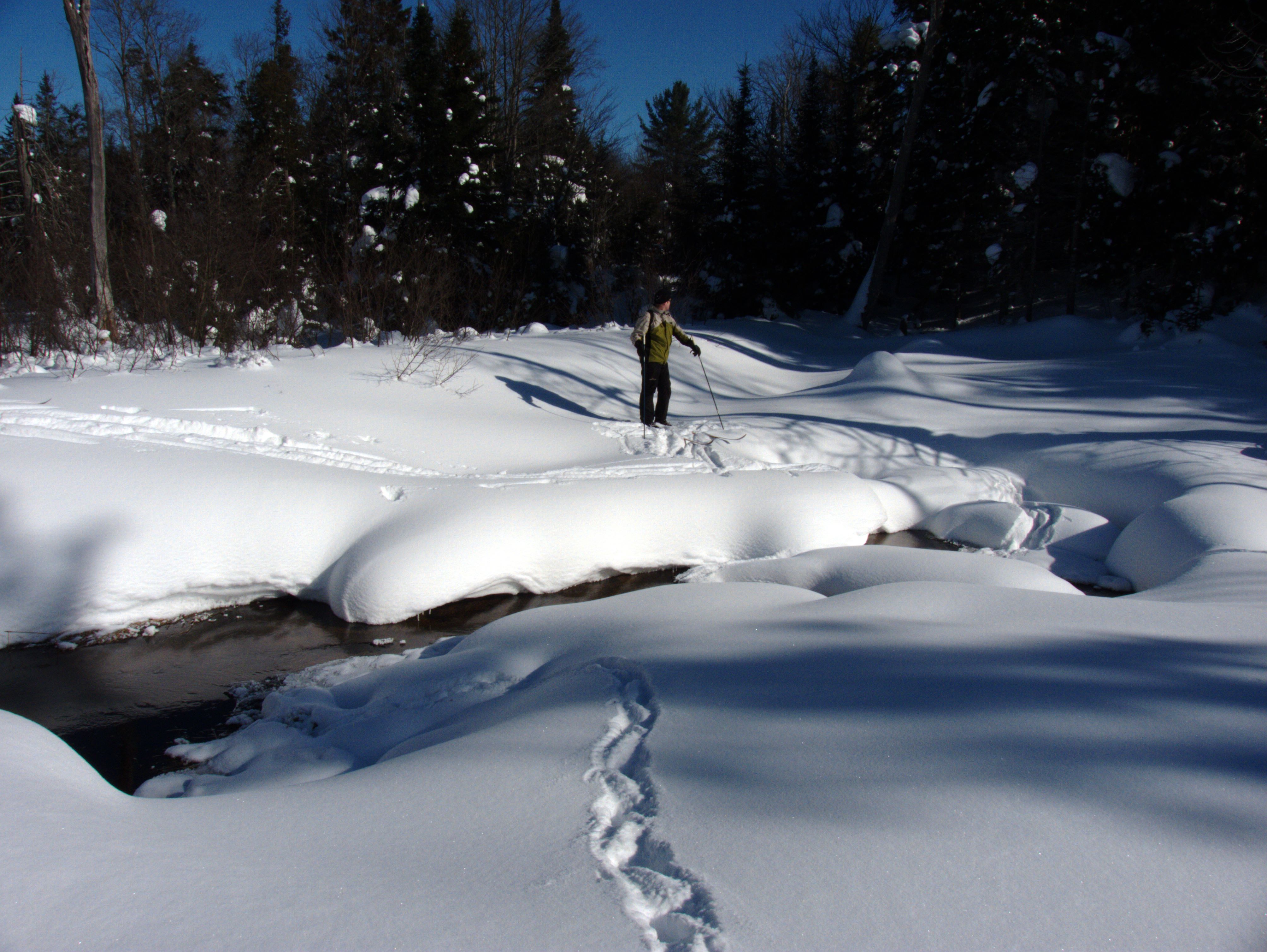 Bill decided to stay at the Cabin and nap while the rest of us went out snowshoeing. We didn't really have a plan, so we just headed mostly north from the Cabin through the marsh and along and across the river. During the trip we ended up wandering through the swap for awhile before crossing the trail that runs along the Loop. Continuing north we made it up to the Sucker river and crossed it. Going ever further north we came upon another trail. I expect this one leads from the intersection of Old Seney and McCloud Grade to a dead end near the Sucker river. At this point the sun was getting low on the horizon so we decided to head back. We wandered along the Sucker river for awhile before finding another beaver dam (which appeared to be in use) covered with a thick layer of snow making a nice bridge. We followed the Loop back around, over the other old beaver dam and got to the Cabin before it became dark.