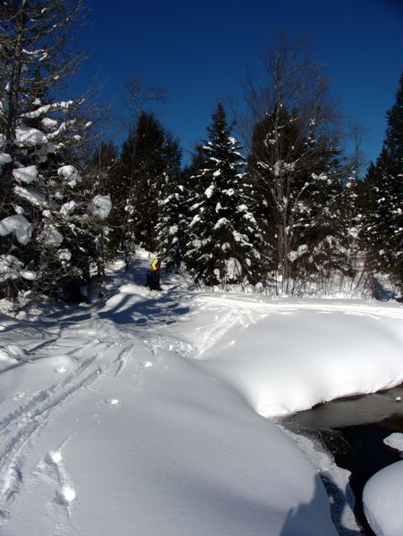 I went to Detroit on the evening of Wednesday, 5 February to meet Bill and spend the night. Jon, Doug, Ed, and Paul left Kalamazoo on Thursday around 5:20 AM. Bill and I left Detroit around 6:20 AM. Once we got away from the snowy streets around Detroit, the trip was quick and easy. We ran into no problems on the drive up except for the numerous stops we had to make for food, forgotten gear, etc. Even so, we arrived at the parking area off M77 at about 2:00 PM, only 20 minutes or so later than the Kalamazoo crew. Once again Mike from the hardware store let us park in a lot he keeps plowed. This convenient parking area made our trip much easier and was greatly appreciated.