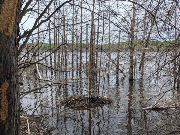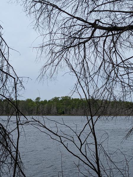 As expected I discovered some new trails and began exploring them. They did run along the eastern shore of the lake. At one point I found a branch that headed closer to the water. When this ended a short hike through the woods brought me to the shore. It seems the water was a bit higher than usual as a number of tree were standing in the water. It turns out I was directly across from the one camp on the lake. Even more amazingly there were people at the camp! I could see what looked like an overturned row boat on the shore which they were moving around. I was quite surprised. There were very few people around and when I had visited the camp a couple of years ago it seemed worse for wear. It is good that it is being used. These were also the only people I saw for the entire trip! Though, since I was across the lake, in the woods, and they did not see me, I did not need to acknowledge them, so maybe it does not count ....